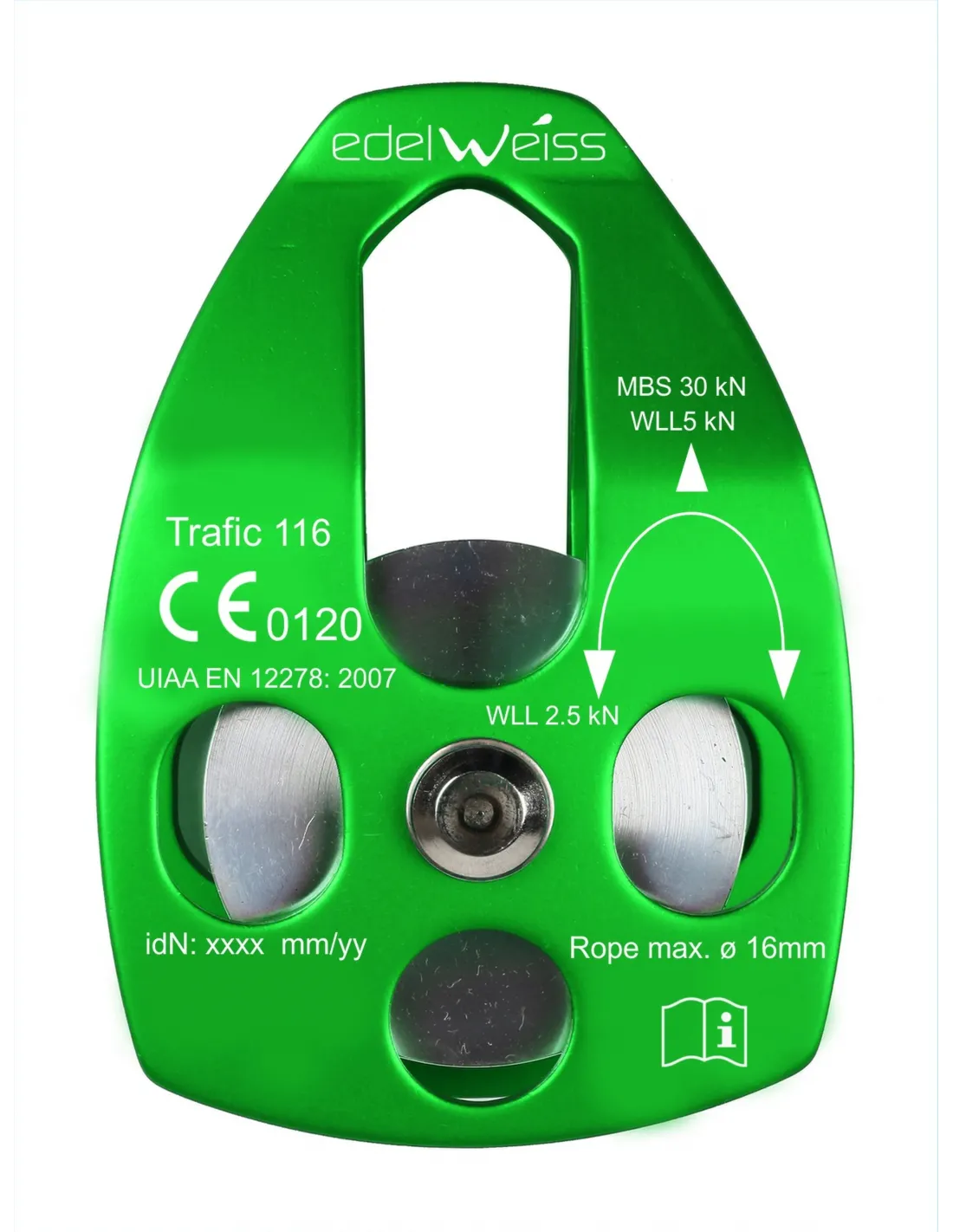 TRAFIC 116 ist eine mobile Einzelrolle mit Platte, die für Flaschenzugsysteme und schwere Lasten ausgelegt ist (Messinglager), sie akzeptiert Seile bis zu 16 mm.