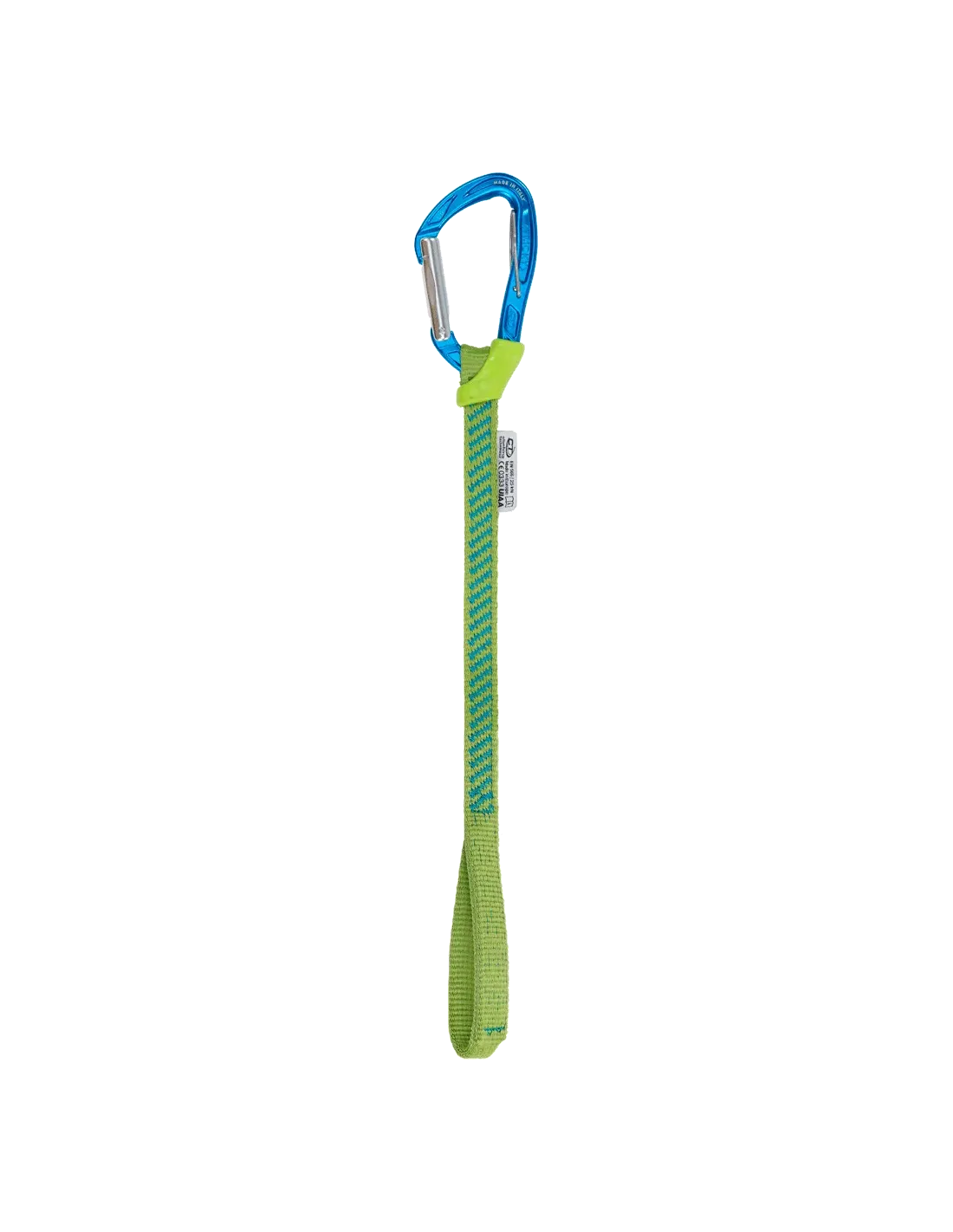 System bestehend aus NIMBLE TRICKY Karabiner, halbstarrer 35 cm langer Polyamidschlinge und FIXIT Gummi.