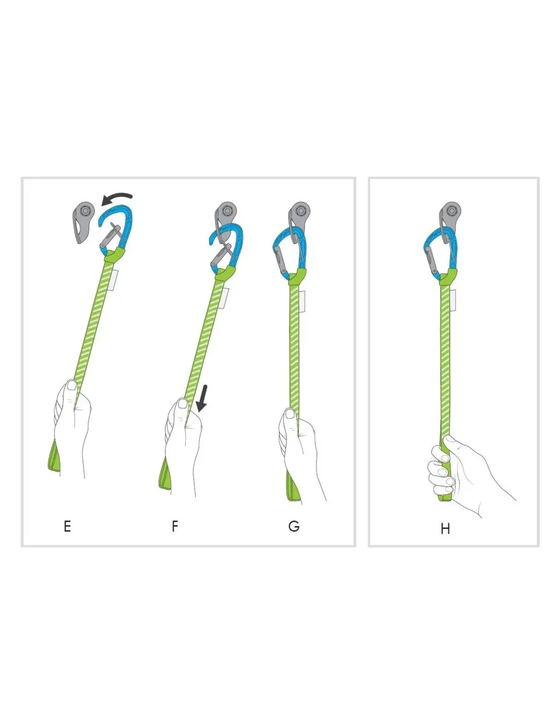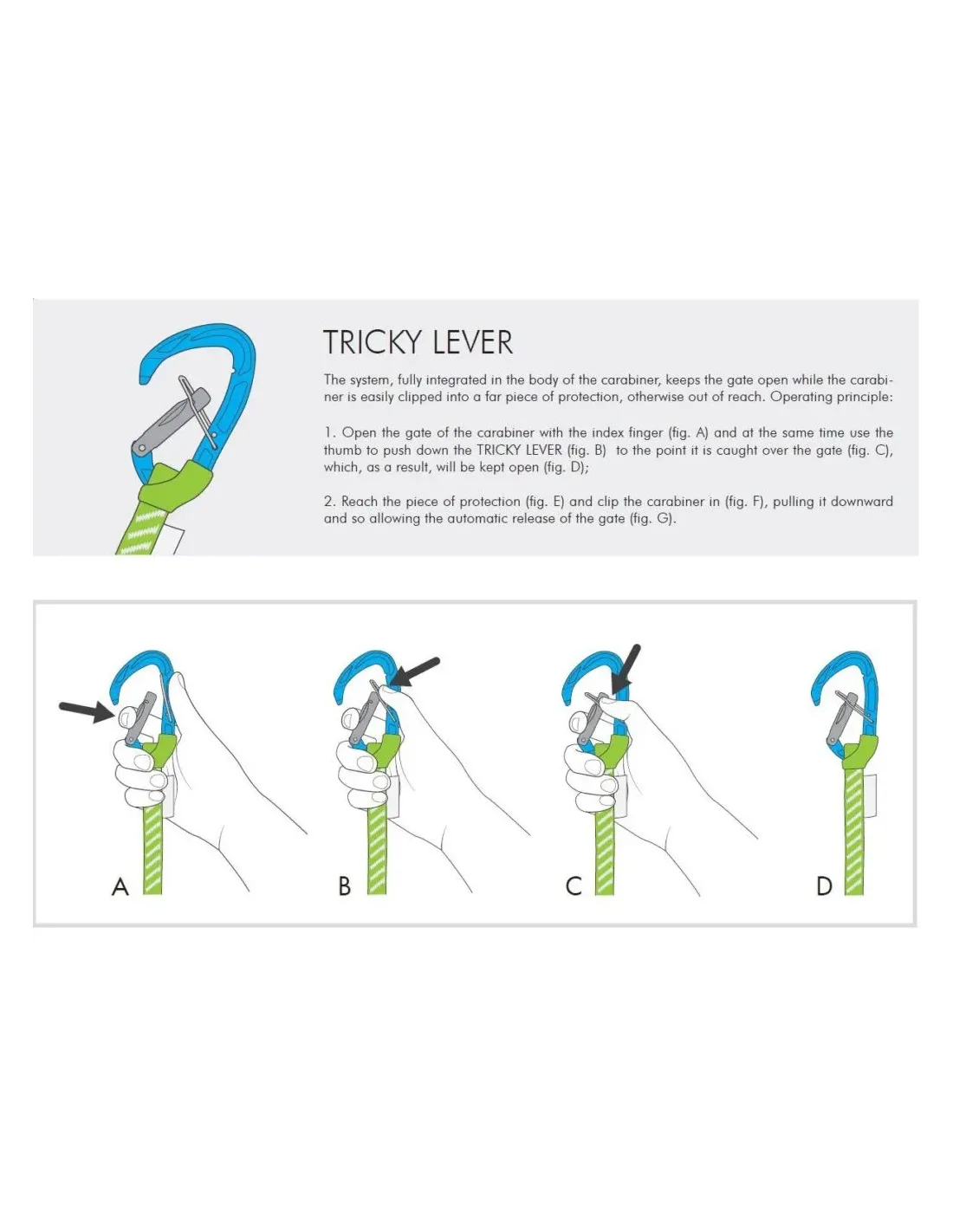 Dank einer langen Schlinge und dem TRICKY LEVER-System, das vollständig in den Körper des Karabiners integriert ist, ermöglicht das Gerät das Einhängen in weit entfernte Positionen. Der Hebel des Karabiners bleibt offen und wird automatisch freigegeben, wenn das System nach unten gezogen wird.