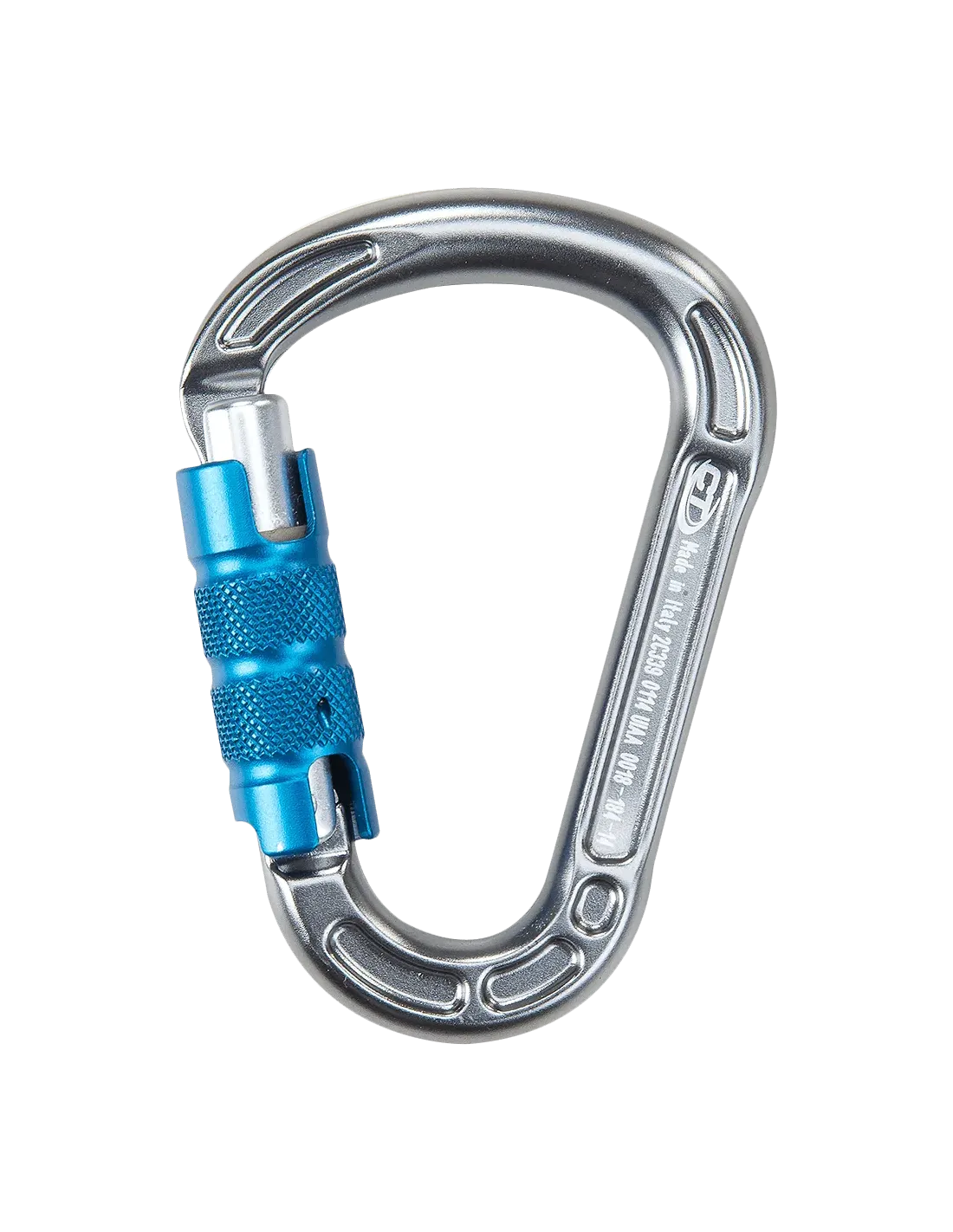 Heißgeschmiedeter Leichtmetall-HMS-Karabiner mit Triplex-Drehverschluss, konzipiert für den Einsatz beim traditionellen und Sportklettern sowie im Bergsteigen allgemein.
