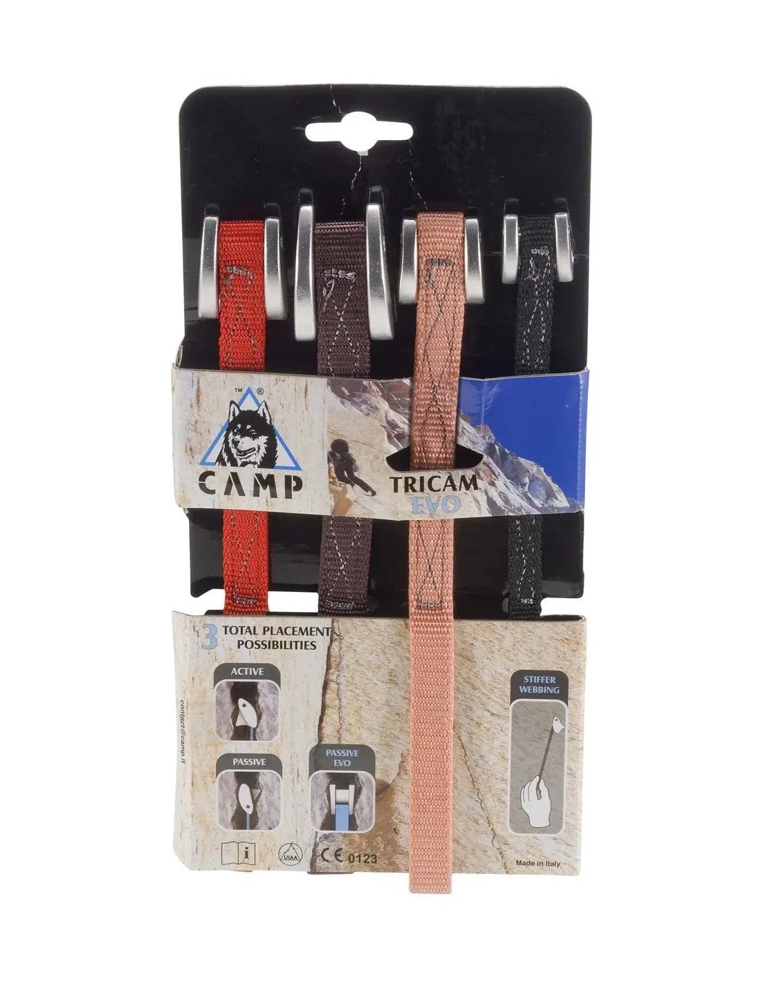 Includes all four sizes of the Tricam Evo that feature three (instead of the historic two) placement possibilities making it even more versatile than the traditional Tricam. Sizes: 0.25, 0.5, 1.0, 1.5.