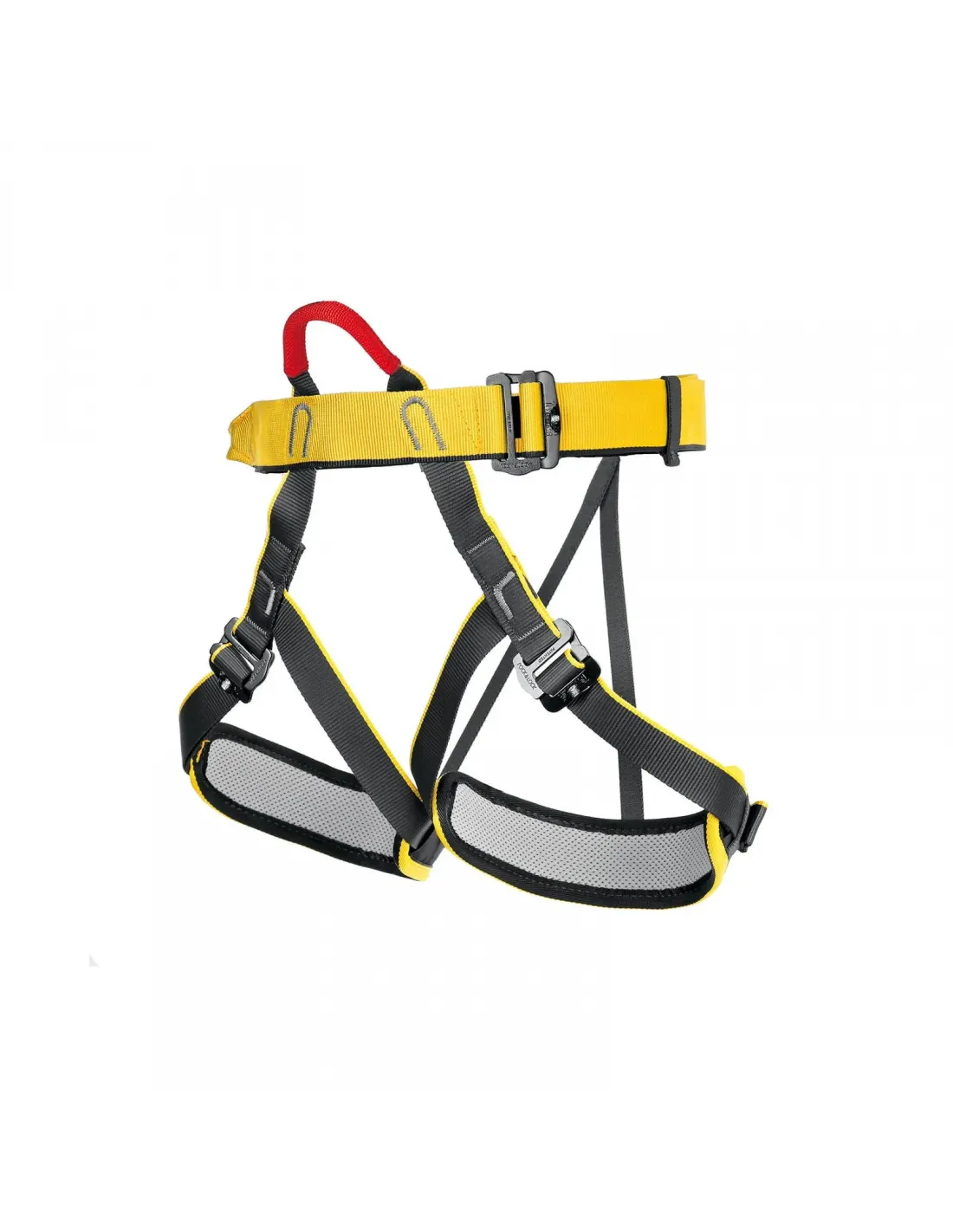 Gurt mit einfachem Design und gepolsterten Beinschlaufen, hauptsächlich für Kletterschulen, Kletterhallen, Klettersteige oder Gletschertouren.