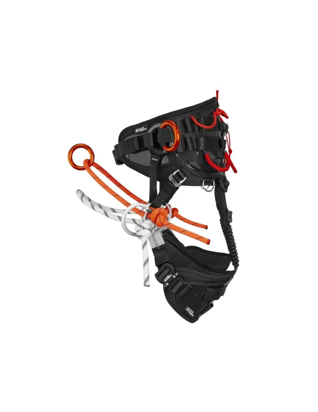 steel D-ring, always in a separate hole and optimised for 11 mm static ropes. The length of the bridges can be easily adjusted using the knots at the end of the ropes. Both rope bridges are easily replaceable, in case of damage or excessive wear. The harness also has two positioning attachment points (EN 358) on the sides of the harness.