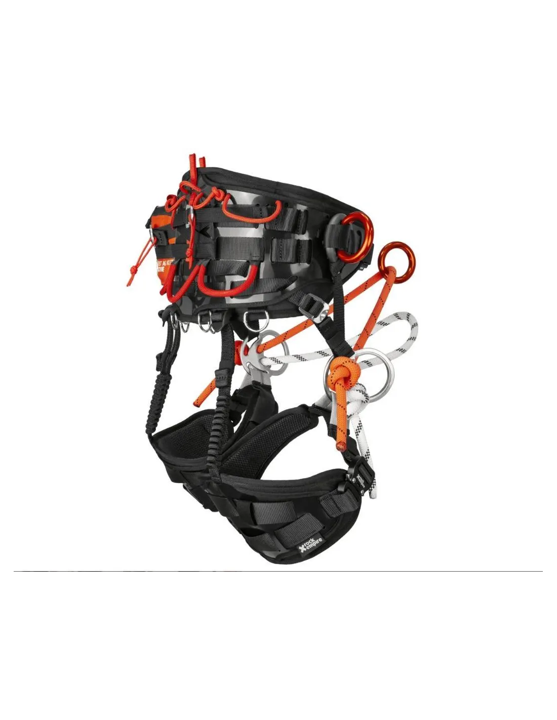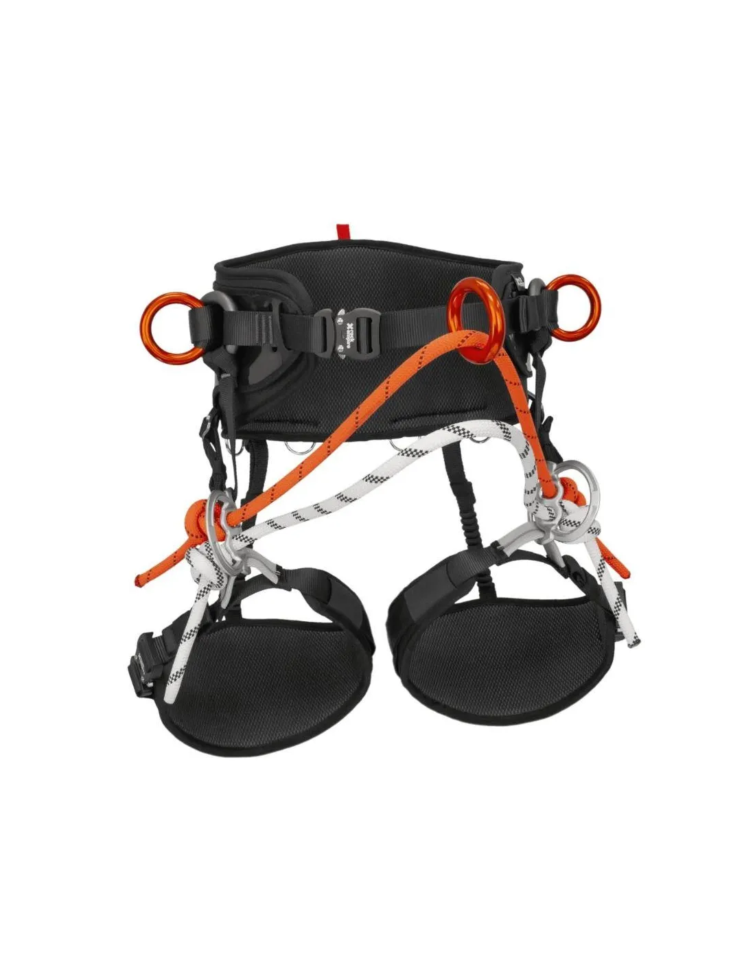 The great advantage of the waist belt is the number of gear attachment points and their maximum variability. On both sides there is a slot for attaching a large carry-tool carabiner.There are also 3 traditionally-shaped gear loops. Holes for an accessory cord (included), from which additional gear loops can be created according to the individual needs of each user. In the middle of the lumbar section, there is a strap (with an aluminium hook) for fixing a first aid kit (not included) and a loop for attaching a simple shoulder harness (sometimes requested for attaching a chest ascender – not included). The waist belt also includes 4 loops with steel rings for attaching larger tools like a chainsaw, for example.