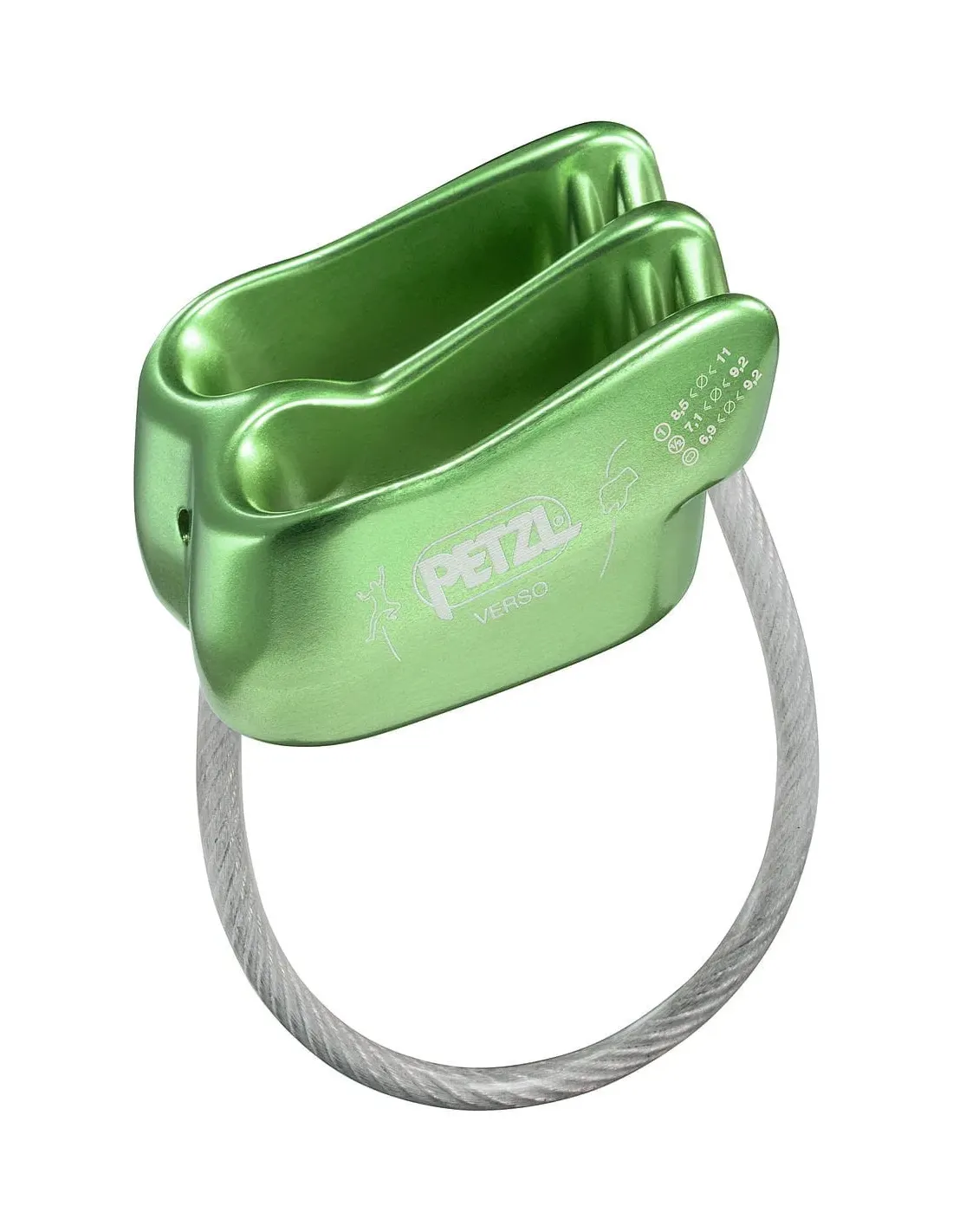 VERSO is Petzl's lightest belay device. It accommodates most rope diameters: single ropes 8.5 to 11 mm, half ropes 7.1 to 9.2 mm and twin ropes 6.9 to 9.2 mm. It is intuitive and easy to use in the gym or at the crag\; well suited for learning how to belay. The specific design of the rope slots allows the rope to glide smoothly and reduces wear.