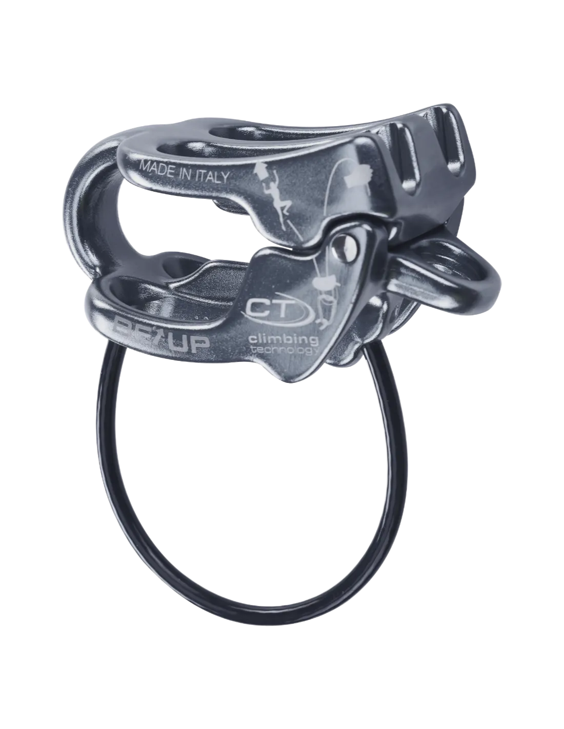 the bringing-up of one or two seconds, with auto-locking and each second being belayed independently of the other (guide mode). The BE UP‘s special shape and the attachment ring built into the body allow you to bring up one or two seconds using twin or half ropes with Ø ≥ 7.3 mm. You can continue to bring-up one second while the other is hanging with their rope locked-off in the BE UP;