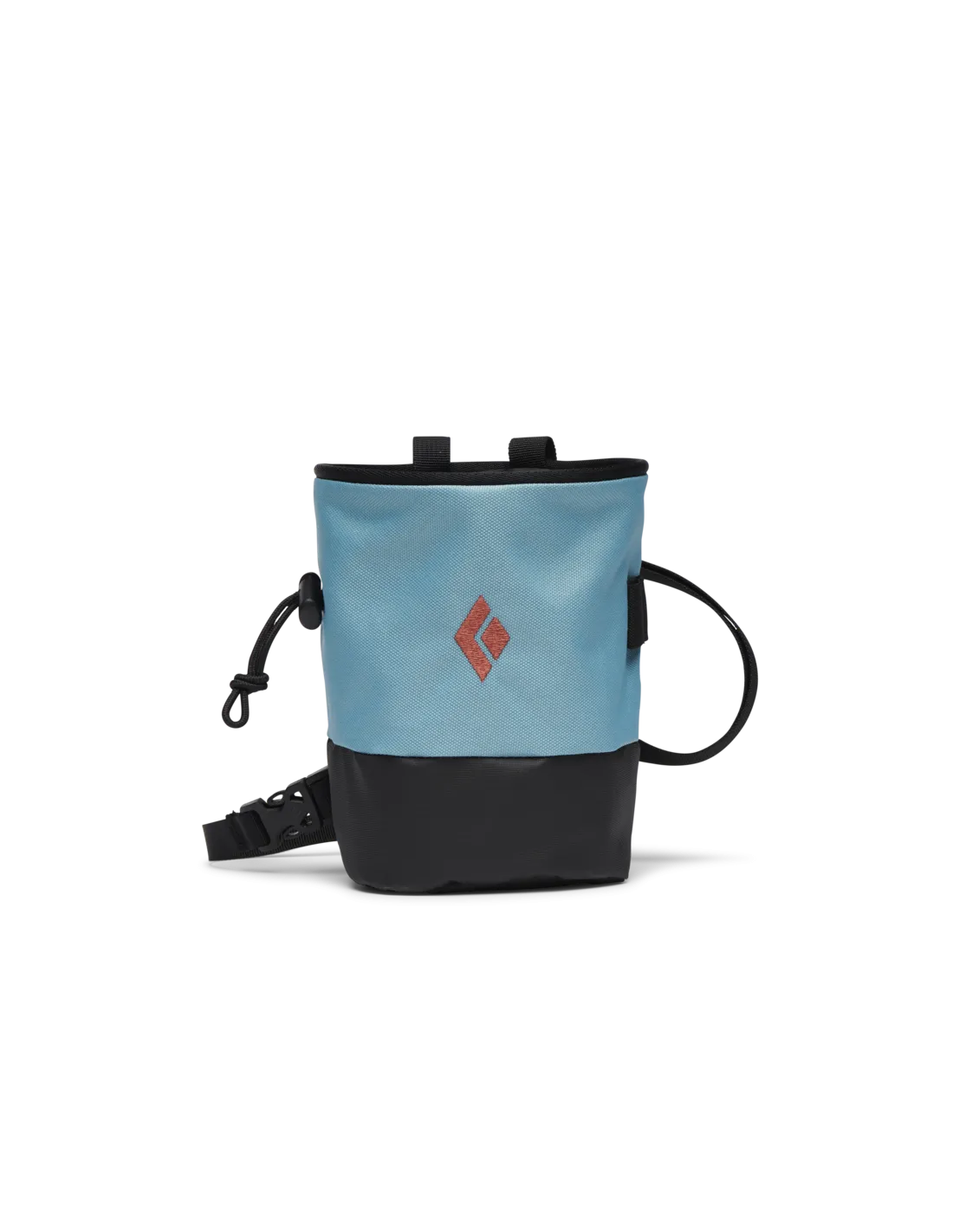 Our classic, cylinder-shaped chalk bag with a pliable wire rim and reinforced TPU lower, the Black Diamond Mojo Zip Chalk Bag also features a rear zippered pocket that holds small essentials like your keys, a route topo or a smartphone. The included webbing belt with a quick-release buckle provides fast on and off.