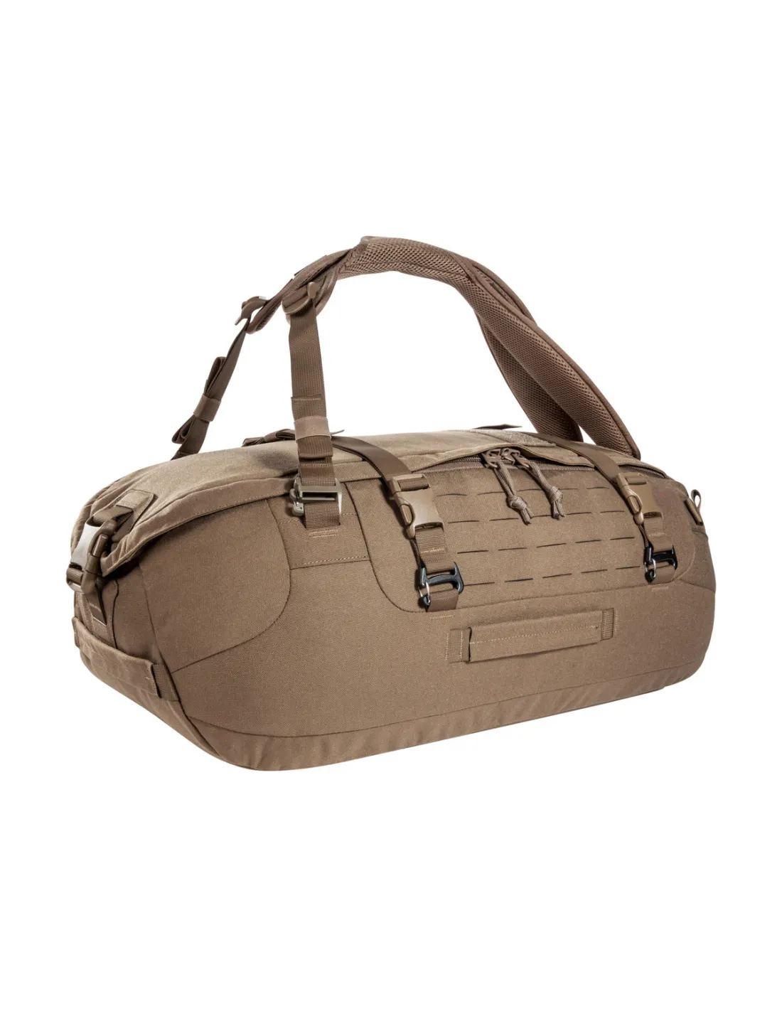 The TT Duffel 45 can be comfortably loaded due to the large opening into the main compartment. The main compartment is lockable. If necessary, the entire bag can be compressed, and it has removable shoulder straps that can be stored in the lid. MOLLE on the outside allows for individual extensions.