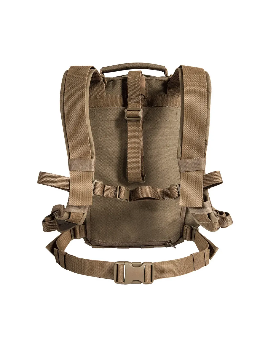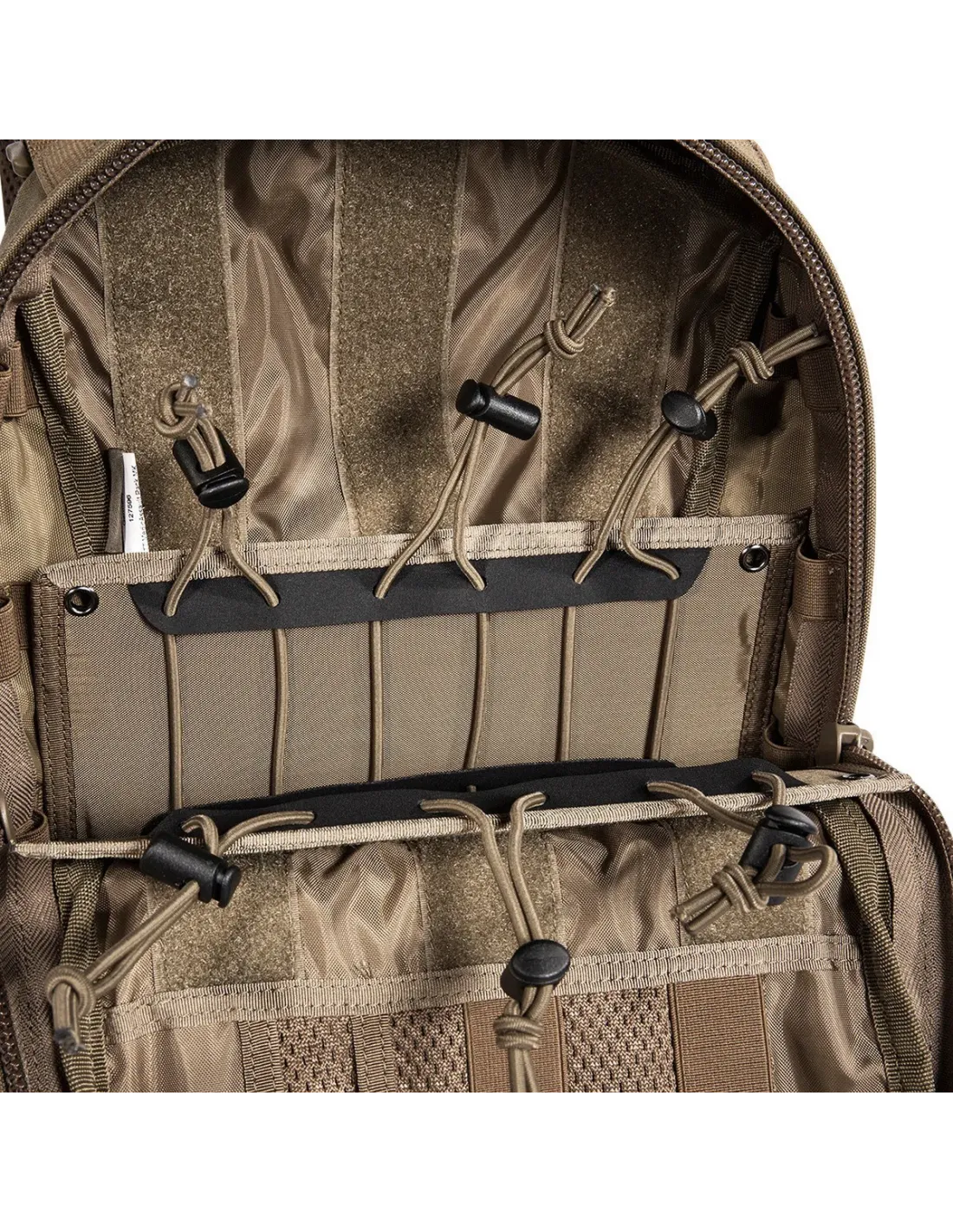 The MOLLE system on the front and sides is laser-cut. The shoulder straps can be removed and kept in a hook-and-loop-secured pouch on the back. The backpack comes with webbing so it can be adapted to a plate carrier or waistcoat. Specially designed for use on plate carrier systems.
