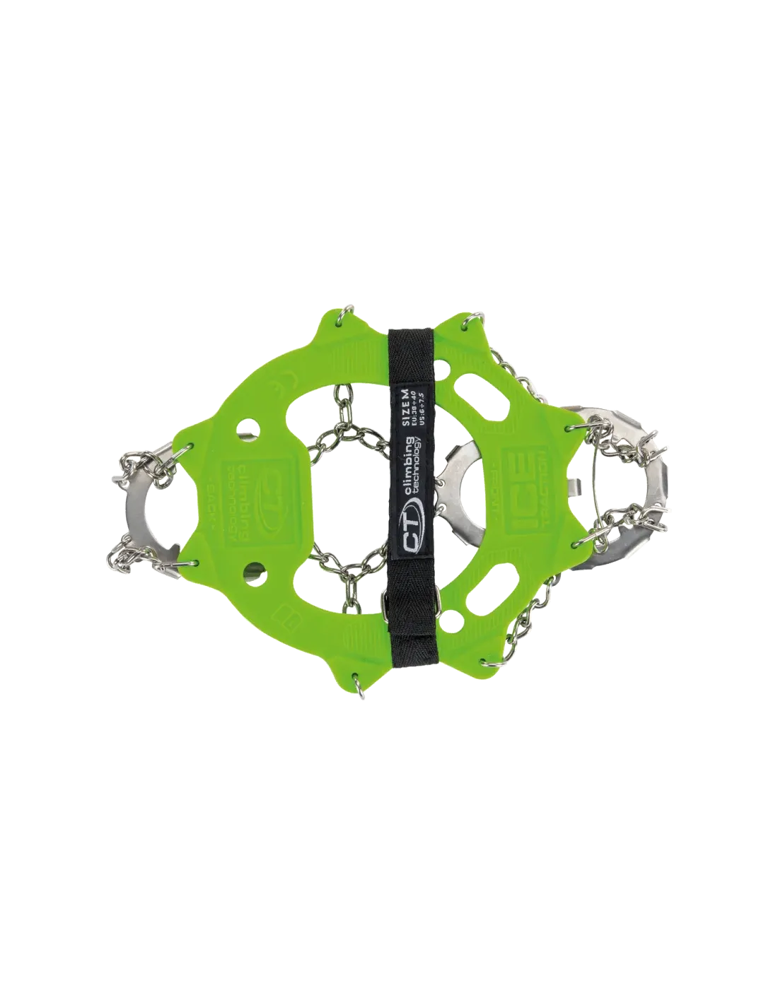 • fastening system made of elastic material that guarantees a tight and stable fit and this makes them suitable for any type of footwear; the constant tension between the silicon band and the metal parts ensures a perfect grip with the anti-slip system on the sole of the footwear;