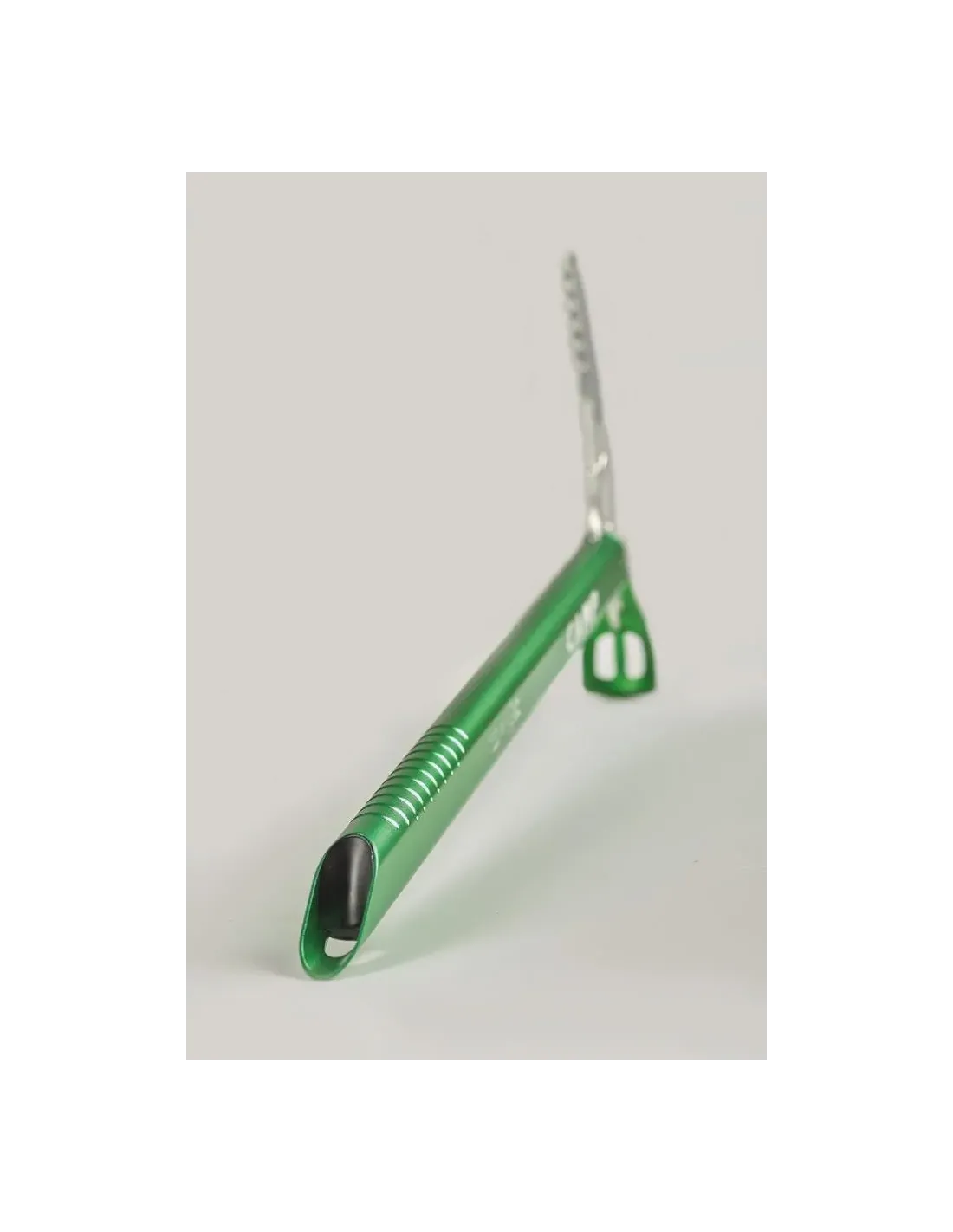 The Corsa is a hyperlight ice axe designed for glacier travel and ski mountaineering. The aluminum alloy construction is lightweight, but still rated Type 1 for use as a snow anchor and self-arrest. A lightweight nylon spike plug keeps snow out of the shaft. The grip is machined for good handling and a small slot in the head allows for seamless integration with the Corsa leash (sold separately).