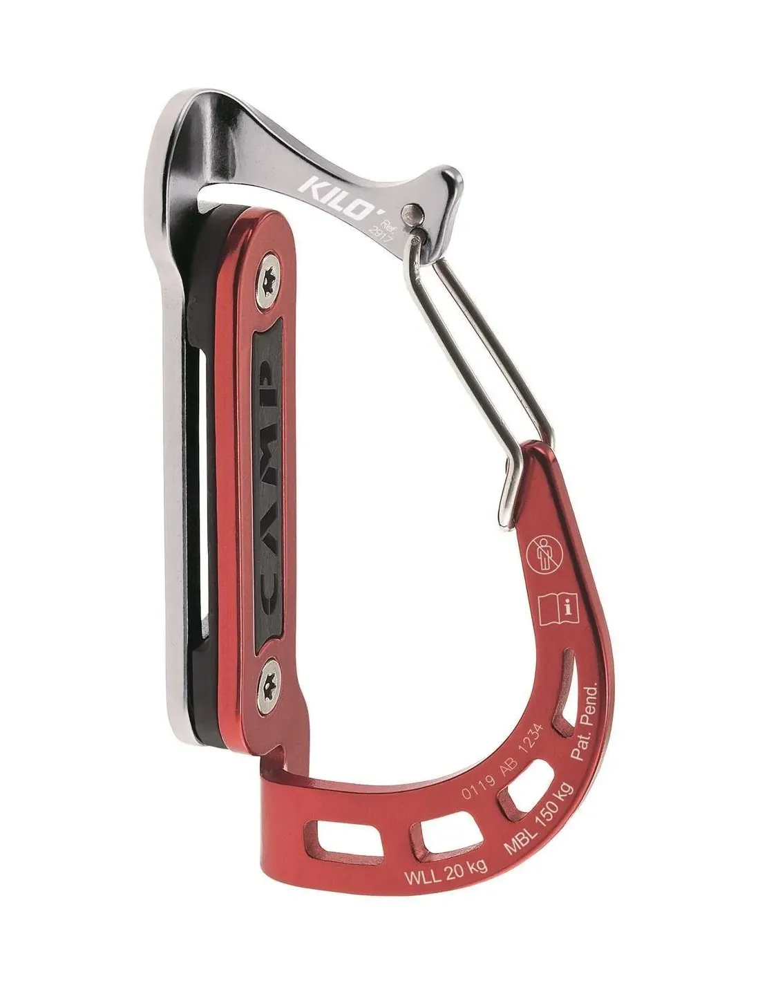 The CAMP Kilo carabiner is designed to carry the equipment required to perform industrial work. Its unique design makes it particularly strong, stable and easy to use. The two-piece aluminum alloy body is connected by stainless steel Torx screws. An internal plastic plate allows the carabiner to be seated on webbing with a maximum width of 45mm.