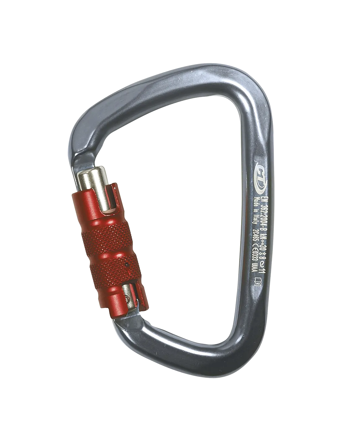 Multipurpose light alloy carabiner, large base and wide sizes, with triplex twist-lock gate, conceived for rescue situations and for alpinism in general.
