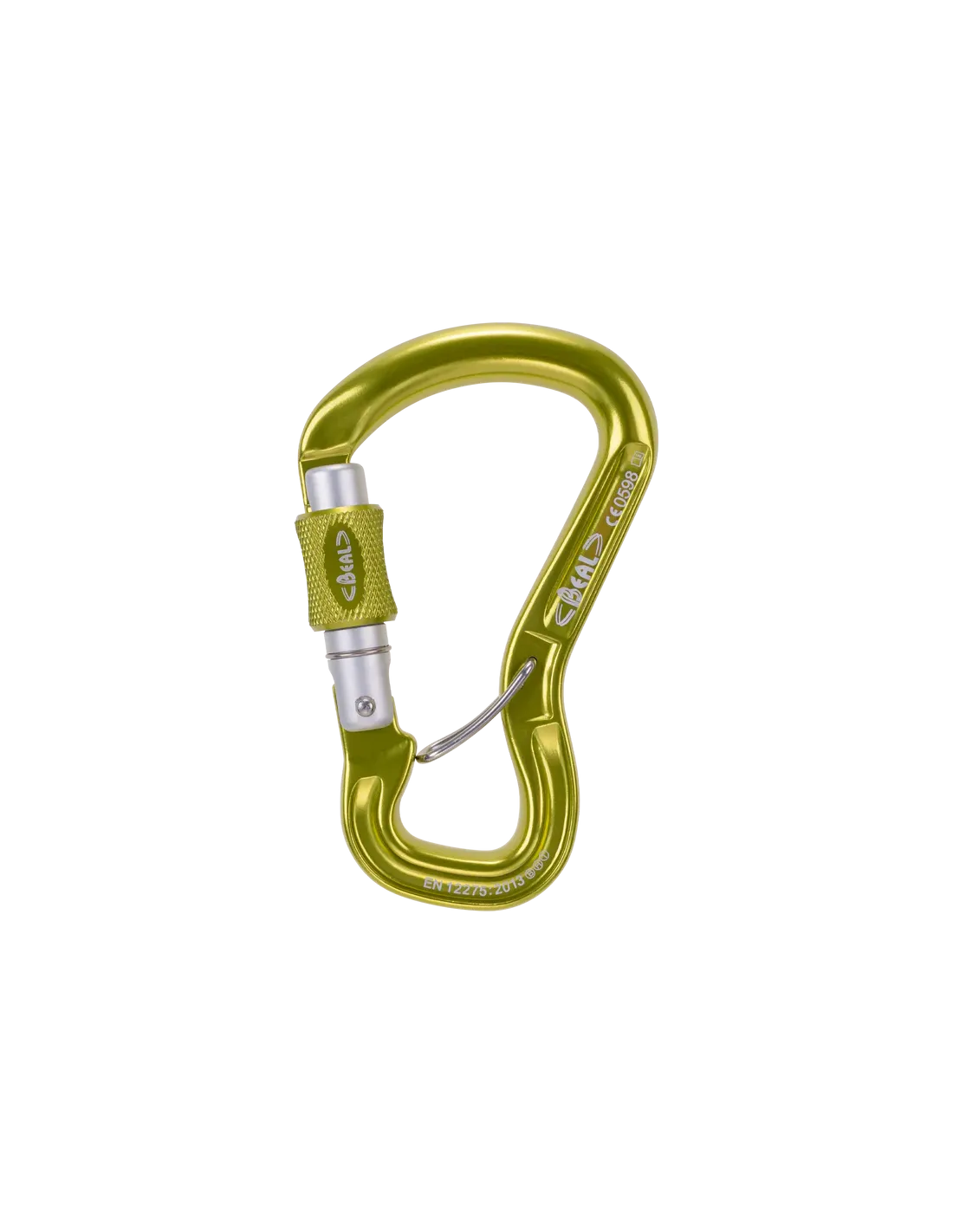 Unidirectional screw gate locking carabiner designed for use with belay plates where the rope passes through the carabiner. The internal snap gate that clips to the harness belay loop keeps the carabiner in proper orientation reducing the chances of cross loading the belay system.