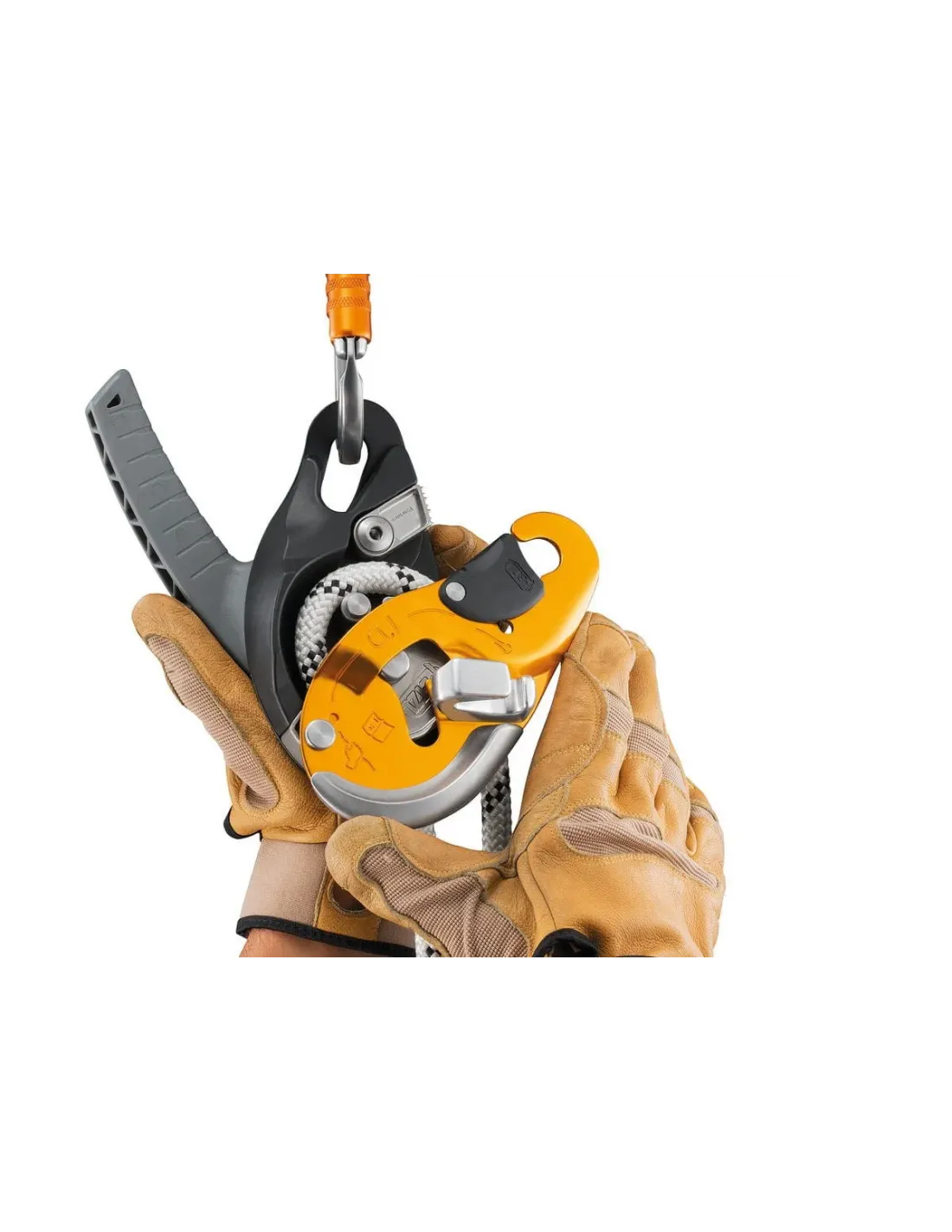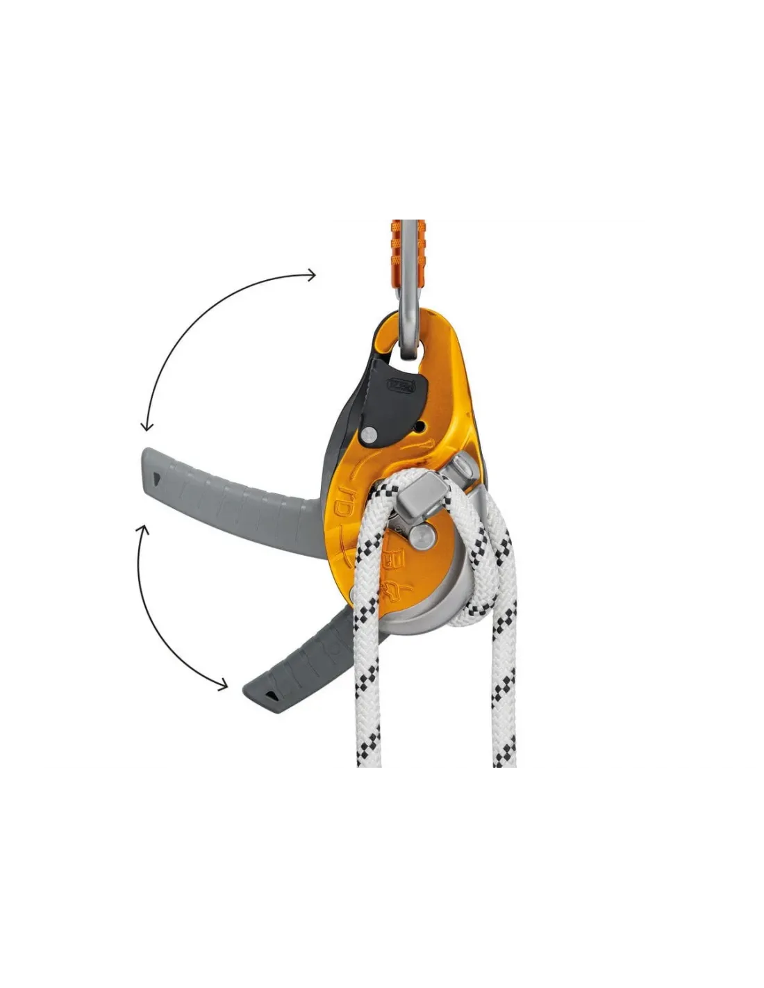 - ergonomic handle allows the rope to be released and enables comfortable control of the descent. Two possible descent modes: on the side plate or in the V-shaped friction channel. The handle is specifically oriented for managing a load from the anchor