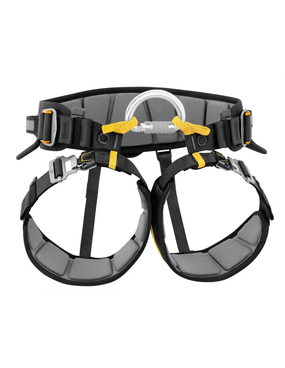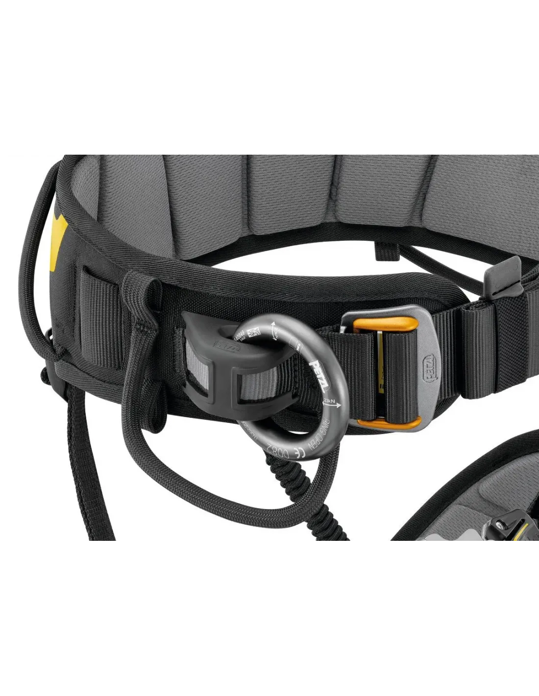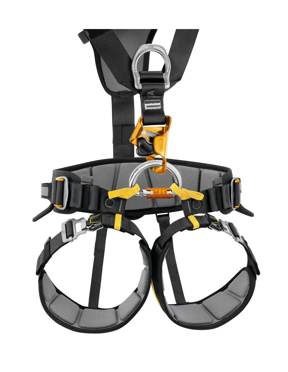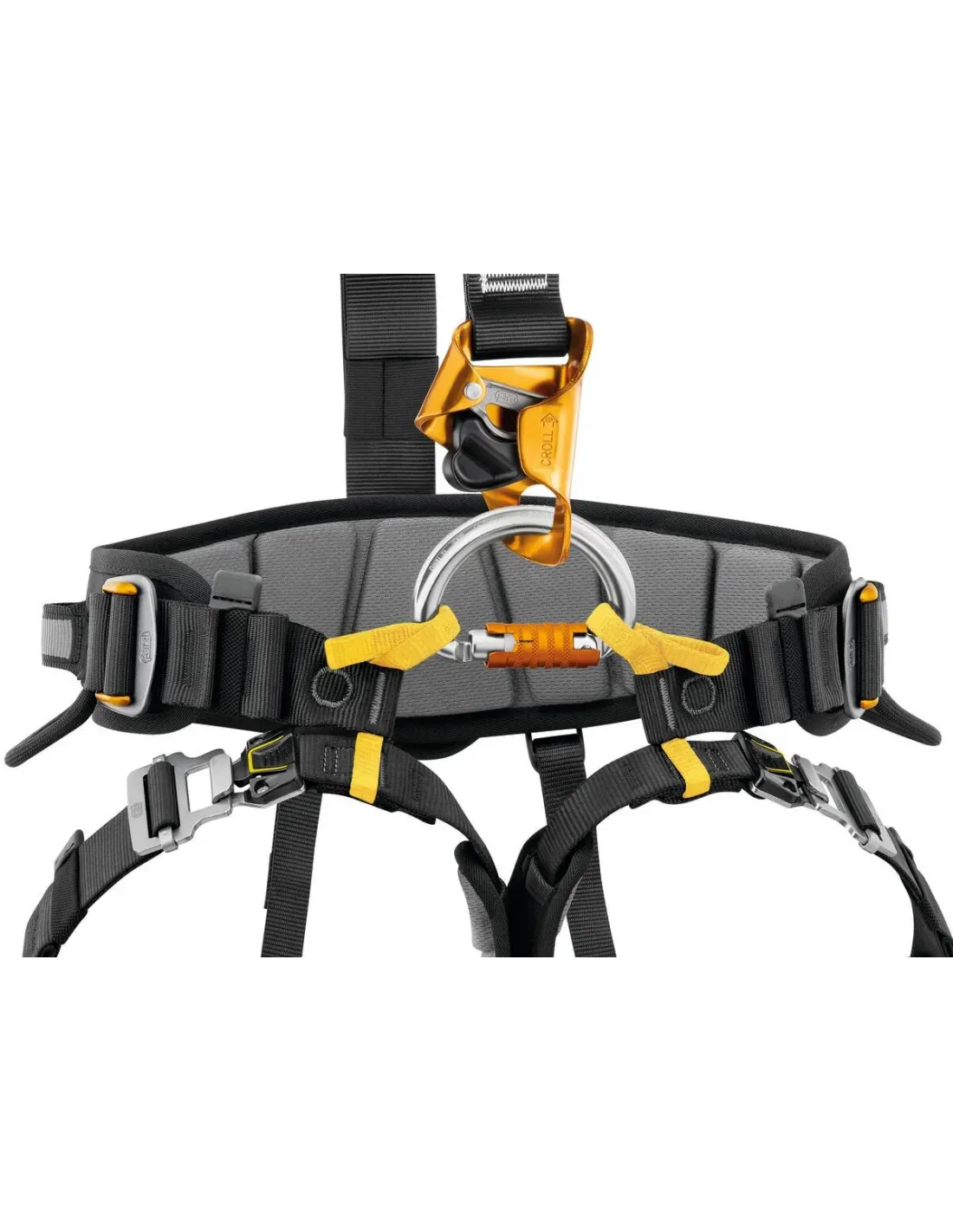 - Two-part ventral attachment point fastens with an OMNI carabiner (or RING OPEN gated ring) and allows connection of a CROLL ventral rope clamp