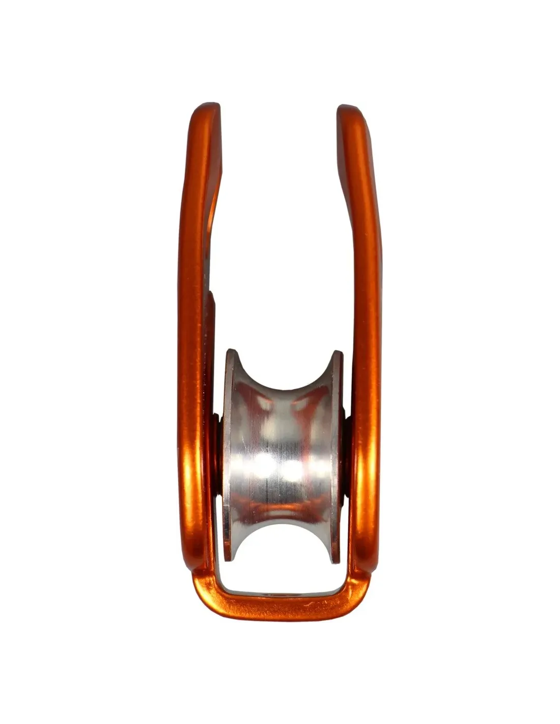 Rope pulley made out of aluminium. Intelligent construction with less material, significantly reduces weight yet maintains strength. An effective solution to reduce rope friction at changes of direction on a long pitch