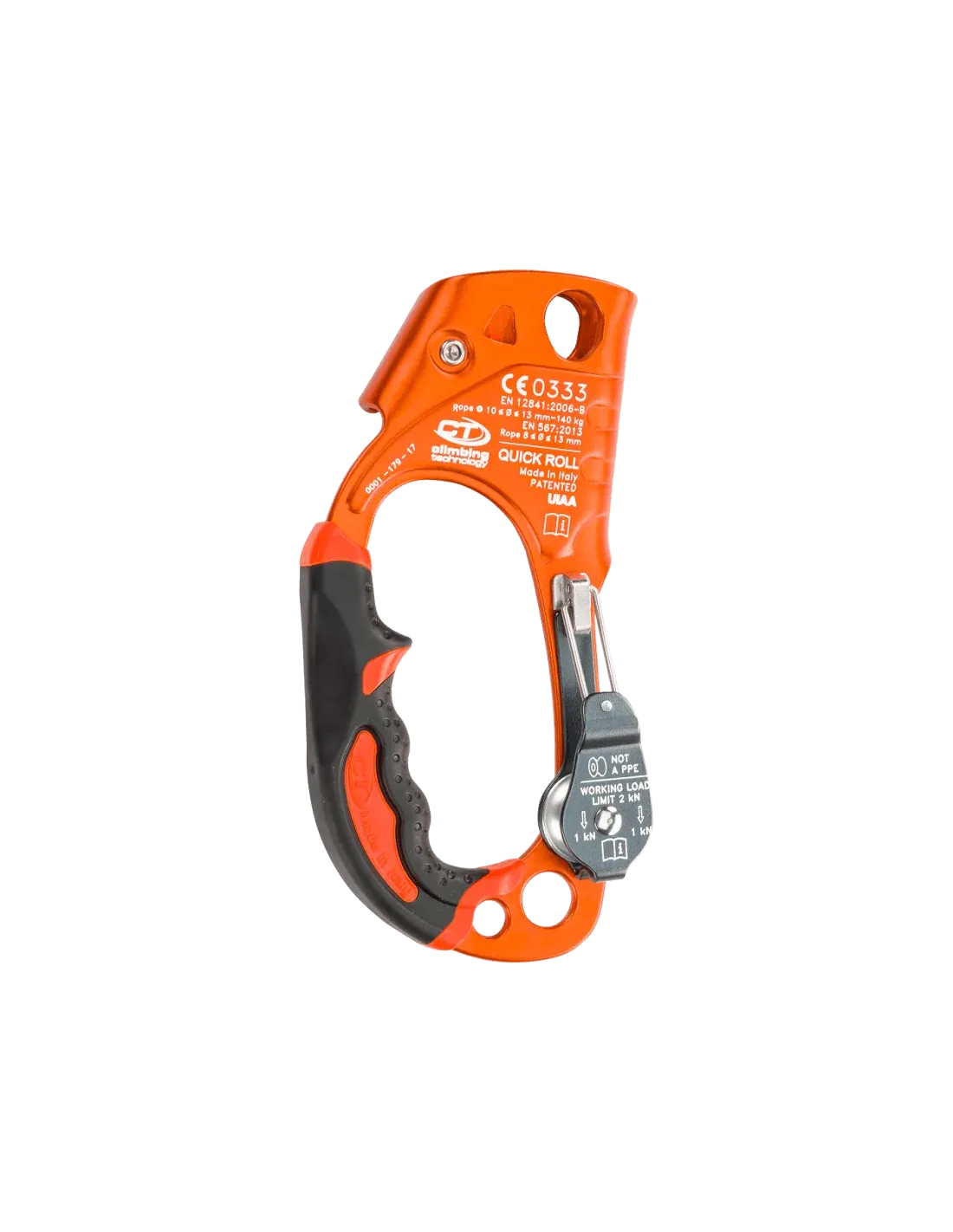 steel cam, manufactured with technology that implements the resistance to wear and tear. Equipped with a set of teeth that protects the wear of the rope, but it is equally effective in blocking and ascending the rope. It also has three slots to prevent the accumulation of mud and reduce the effort needed to slide the device up the rope under any condition (muddy rope, frozen etc.);