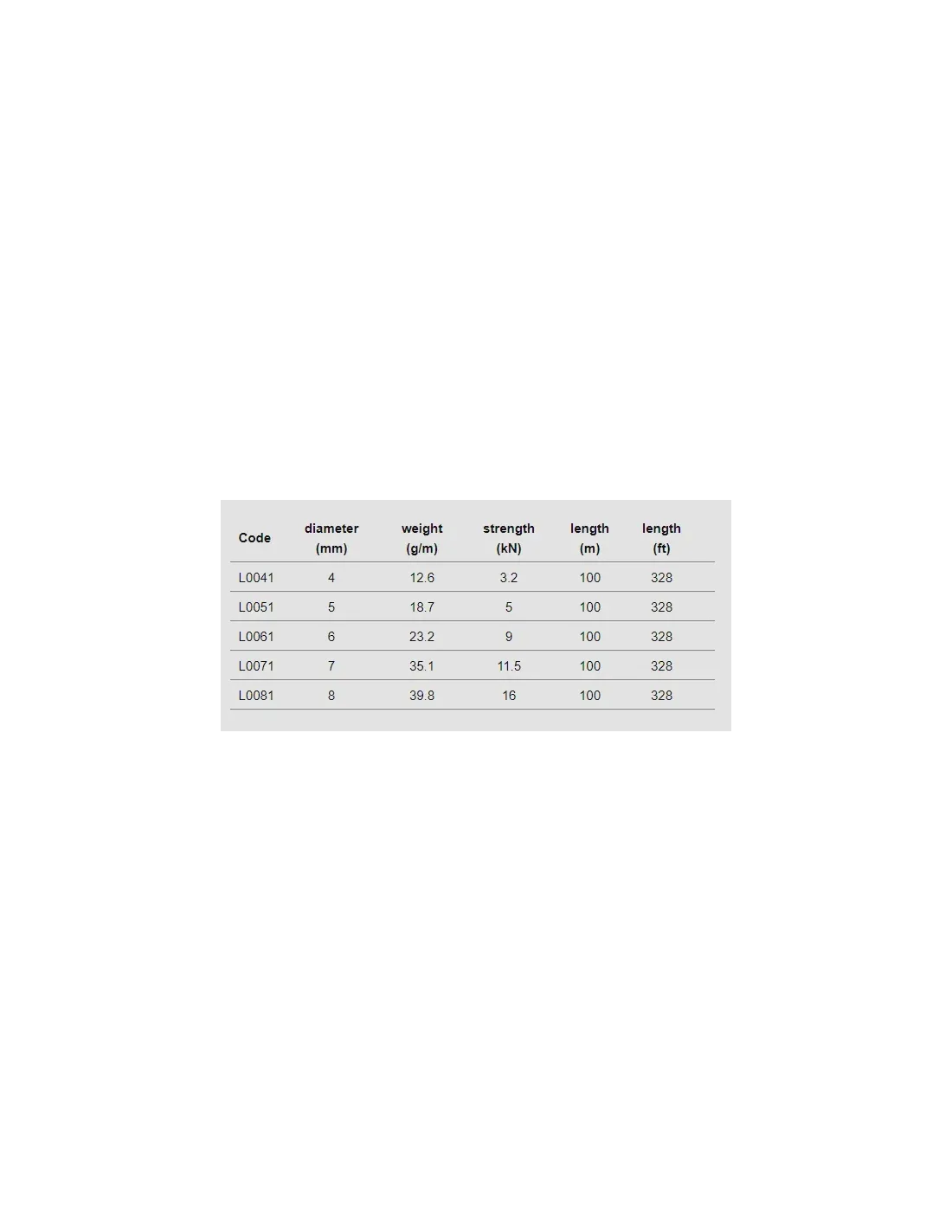 | Code | diameter (mm) | weight (g/m) | strength (kN) |