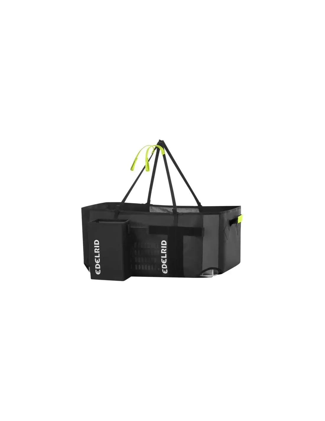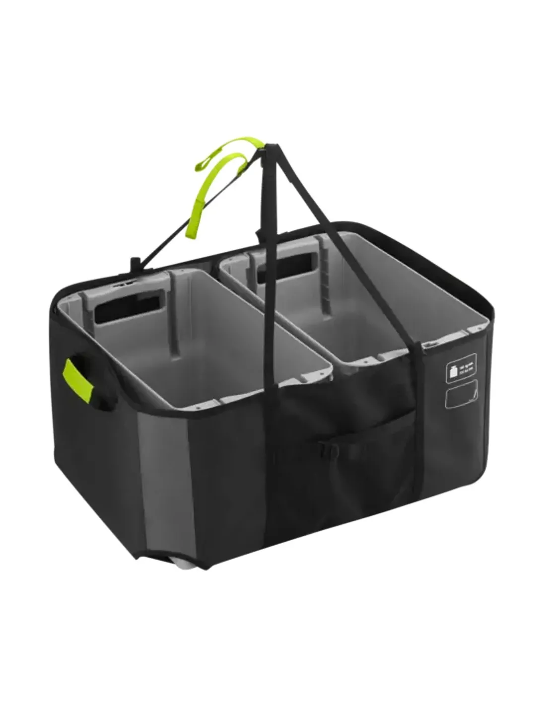 Practical and secure transport aid for route setters that perfectly holds the euro containers commonly used in most climbing gyms for storing holds or two type 2 mail containers. The all-round strap system withstands loads of up to 150 kg and can be suspended at two angles to allow the attachment of two SETTER BAGS. Internal dimensions: 630 x 420 x 300 mm.