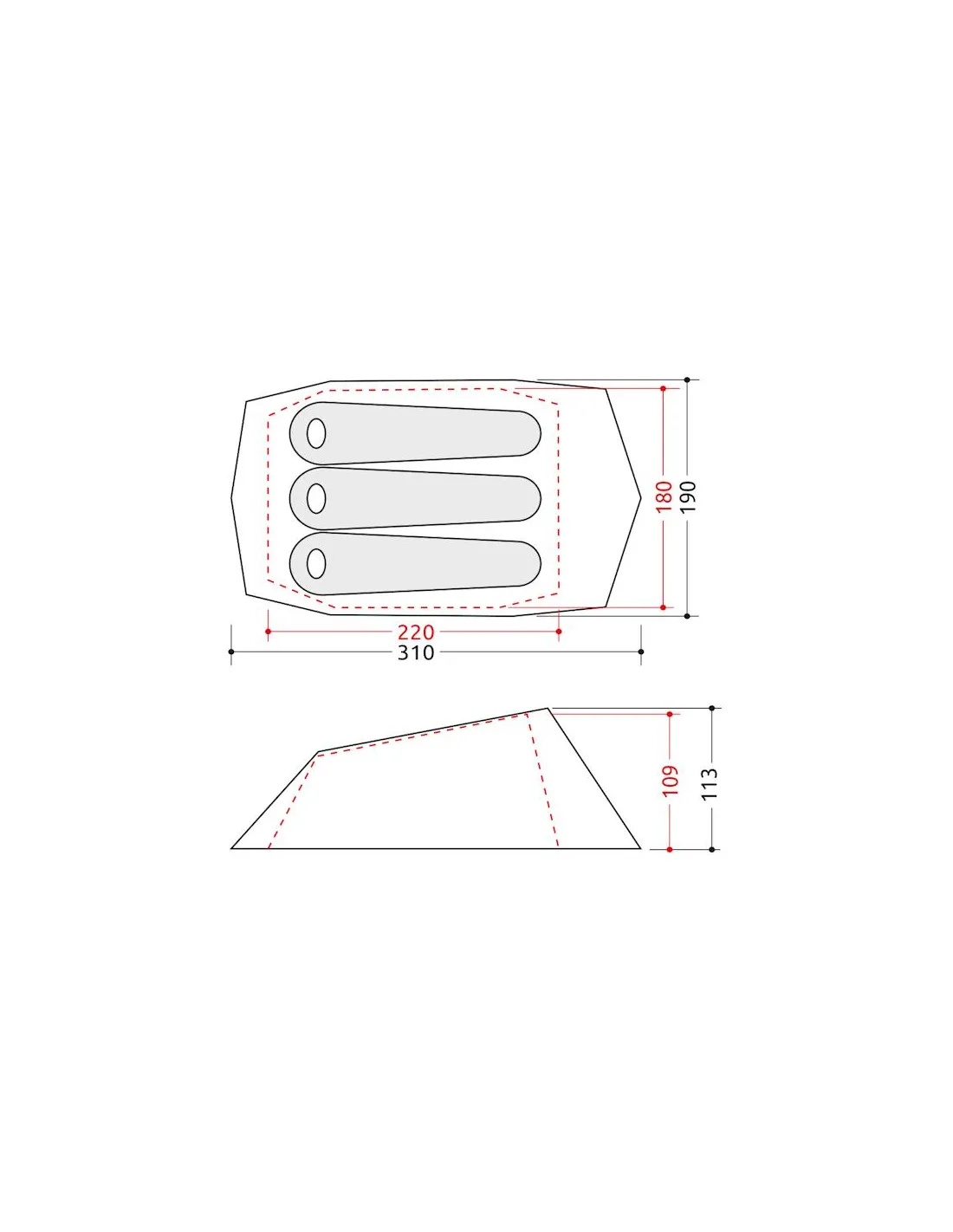 Dimensiones de la tienda: 190 x 310 x 113 cm (rastreador) ; 180 x 220 x 109 cm (interior).