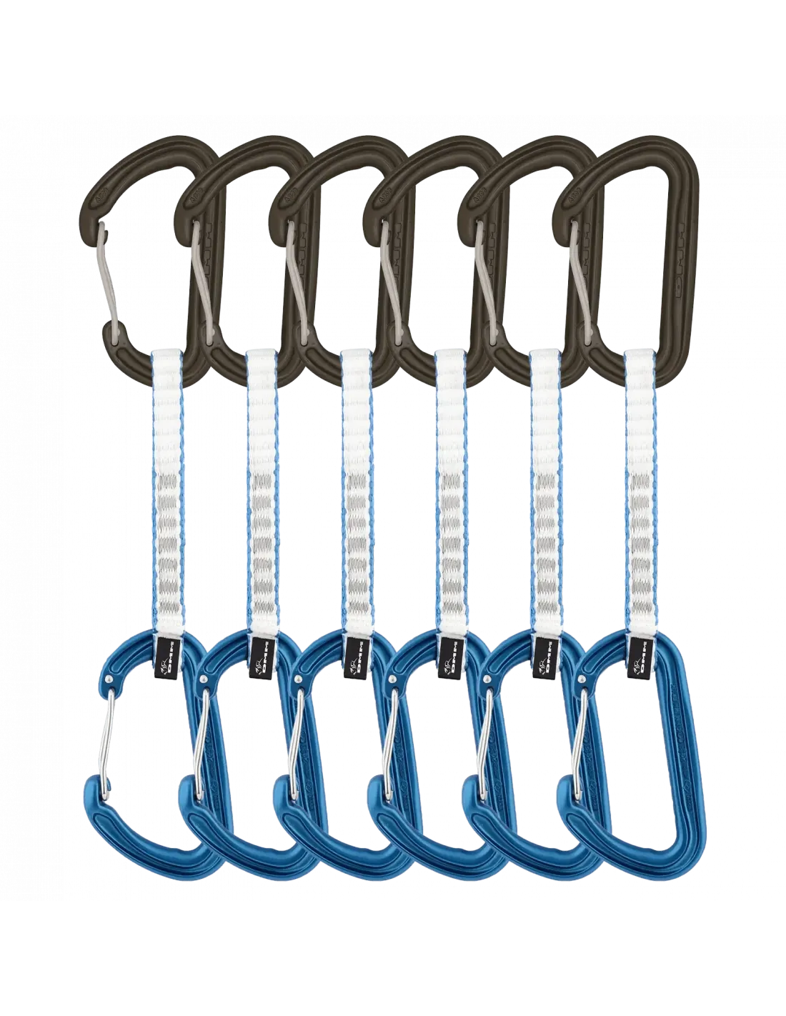 Las gamas polivalentes están montadas en Dynatec de 11 mm para ofrecer cintas exprés que se pueden usar para escalada deportiva, tradicional o invernal. Los mosquetones de tamaño completo son fáciles de manejar cuando estás cansado o llevas guantes, mientras que el Dynatec de 11 mm es ligero y robusto. Si deseas un conjunto de cintas exprés para cubrir toda tu escalada, opta por las polivalentes.