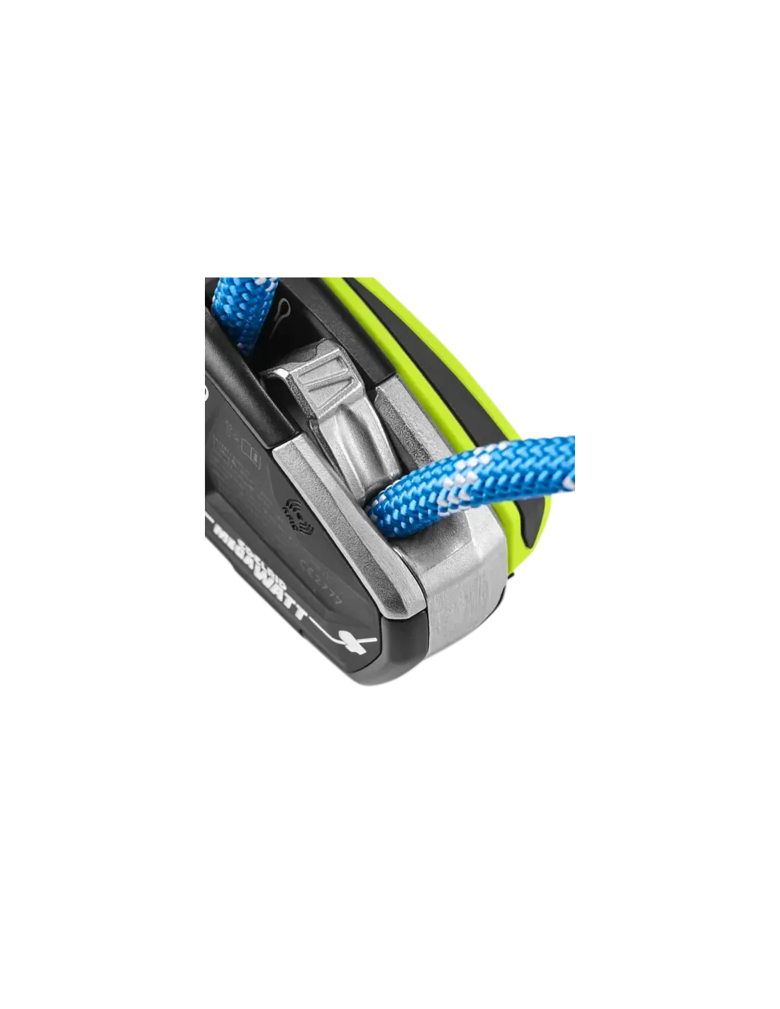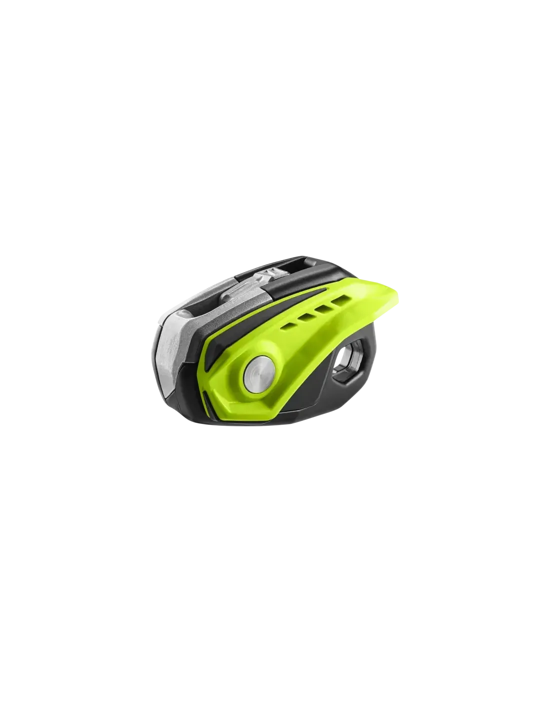 El bloqueo de seguridad de cuatro vías permite insertar la cuerda sin tener que separar el dispositivo del mosquetón. Las inserciones de acero en los puntos especialmente cargados aumentan la vida útil del dispositivo.