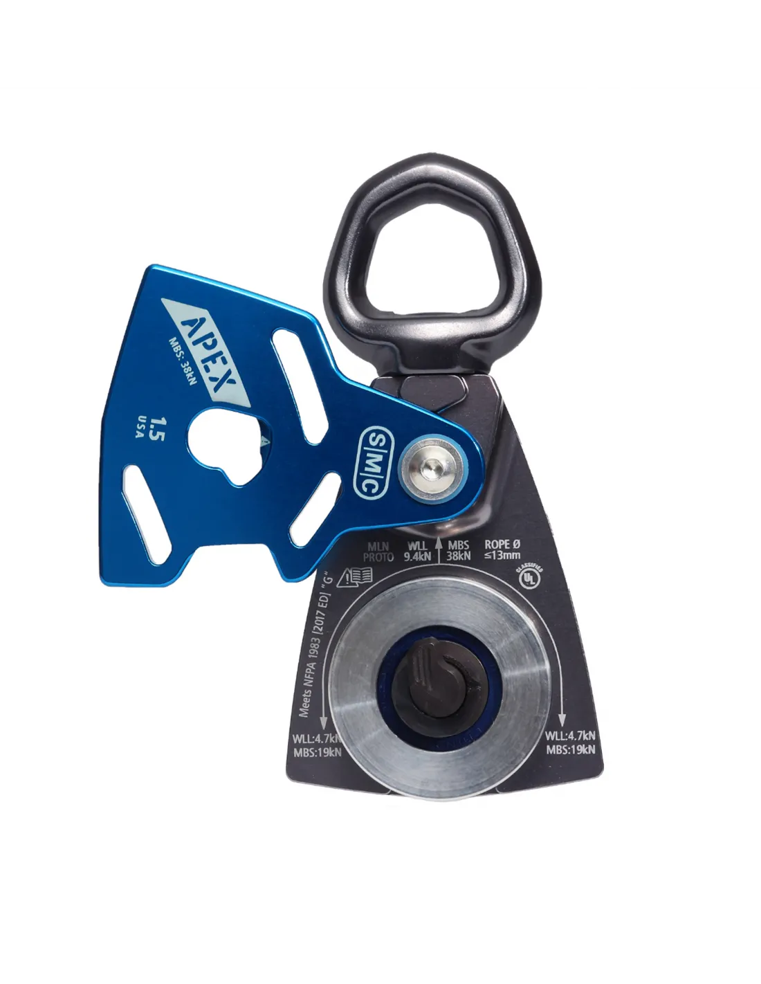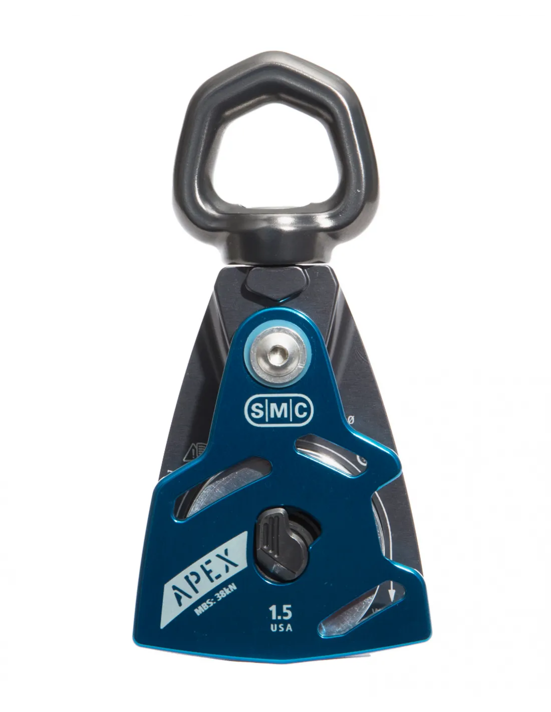 El APEX es una polea giratoria de 3 acciones que se puede abrir con una mano. Su resistente cierre se opera mediante tres acciones distintivas: girar el cierre, presionar el cierre y girar la placa lateral. Para activar el bloqueo y asegurar la cuerda, simplemente cierre la placa lateral.